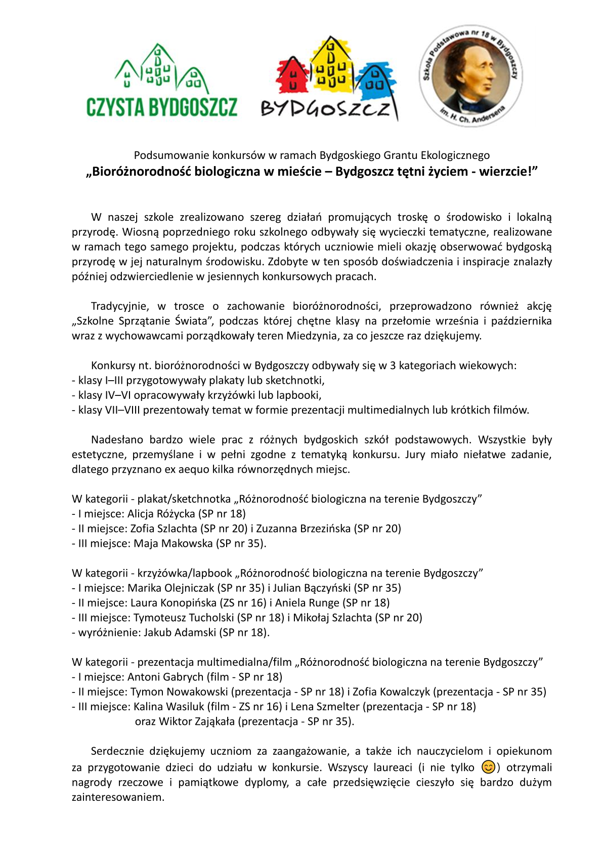 Czytaj więcej!Podsumowanie konkursów w ramach Bydgoskiego Grantu Ekologicznego „Bioróżnorodność biologiczna w mieście – Bydgoszcz tętni życiem - wierzcie!”