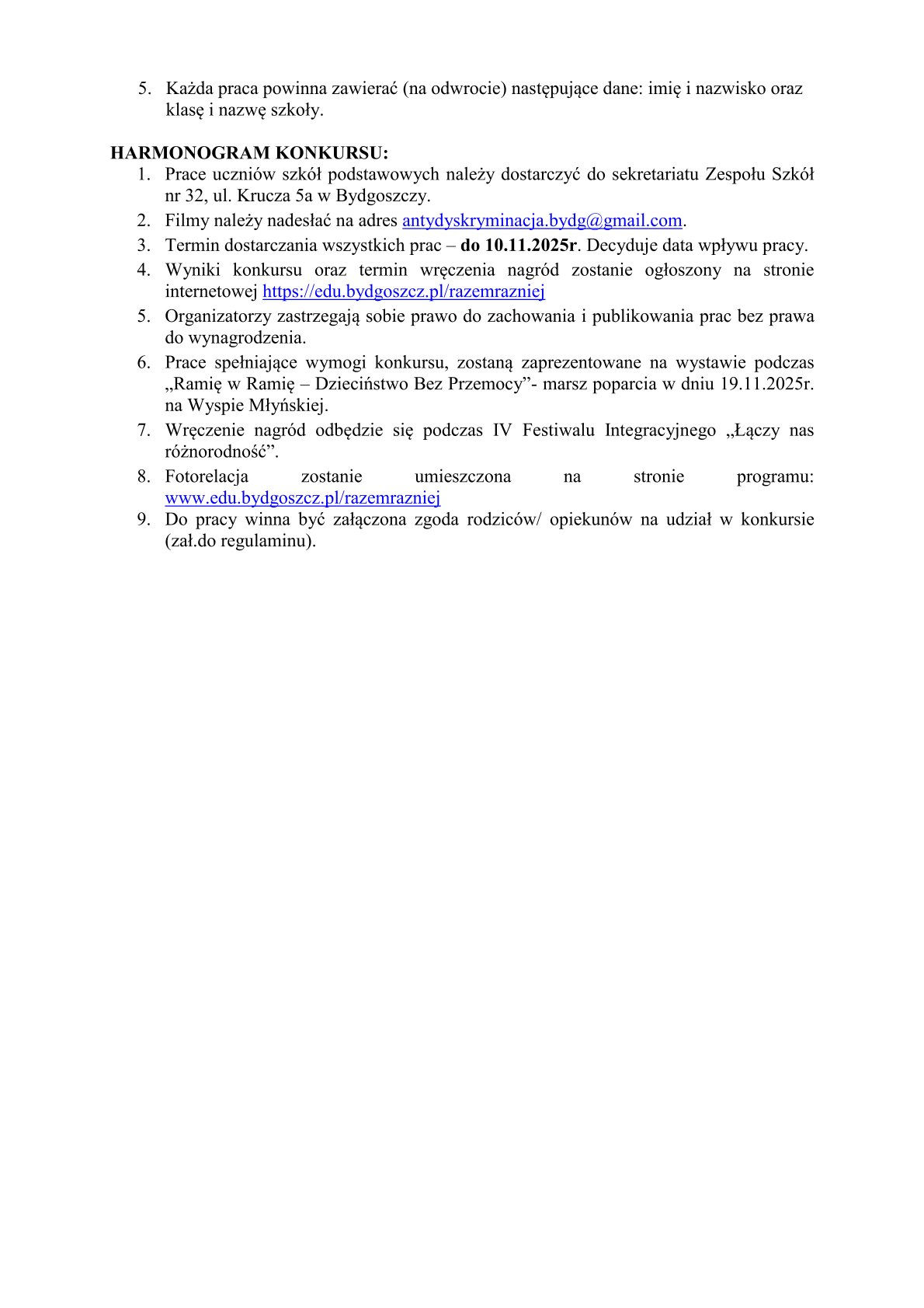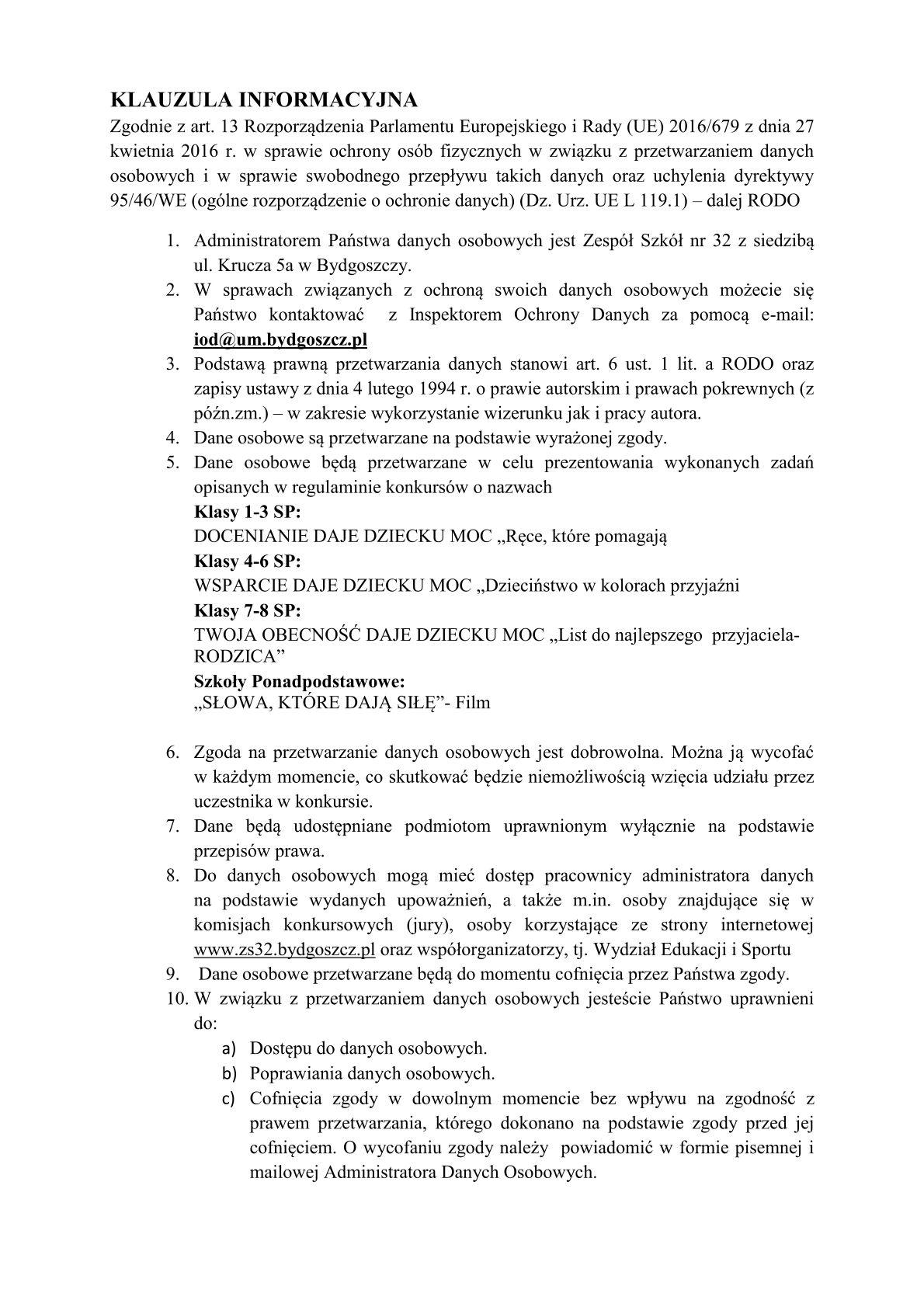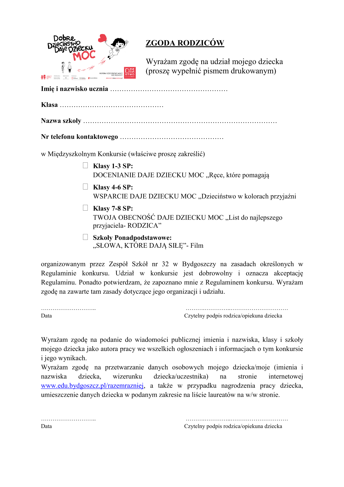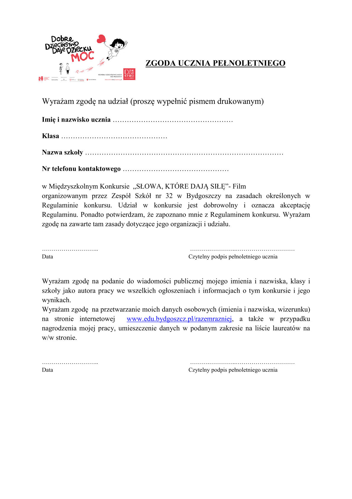Zespół Szkół nr 32 jako koordynator Miejskiego programu edukacji antydyskryminacyjnej "Razem Raźniej" serdecznie zaprasza do włączenia się w realizację przedsięwzięć Kampanii "Dzieciństwo Bez Przemocy". Zachęcamy uczniów Państwa placówki do wzięcia udziału w konkursie stanowiącym spójną całość odnoszącą się do hasła przewodniego „DOBRE DZIECIŃSTWO DAJE DZIECKU MOC”- szczegóły w załączeniu.