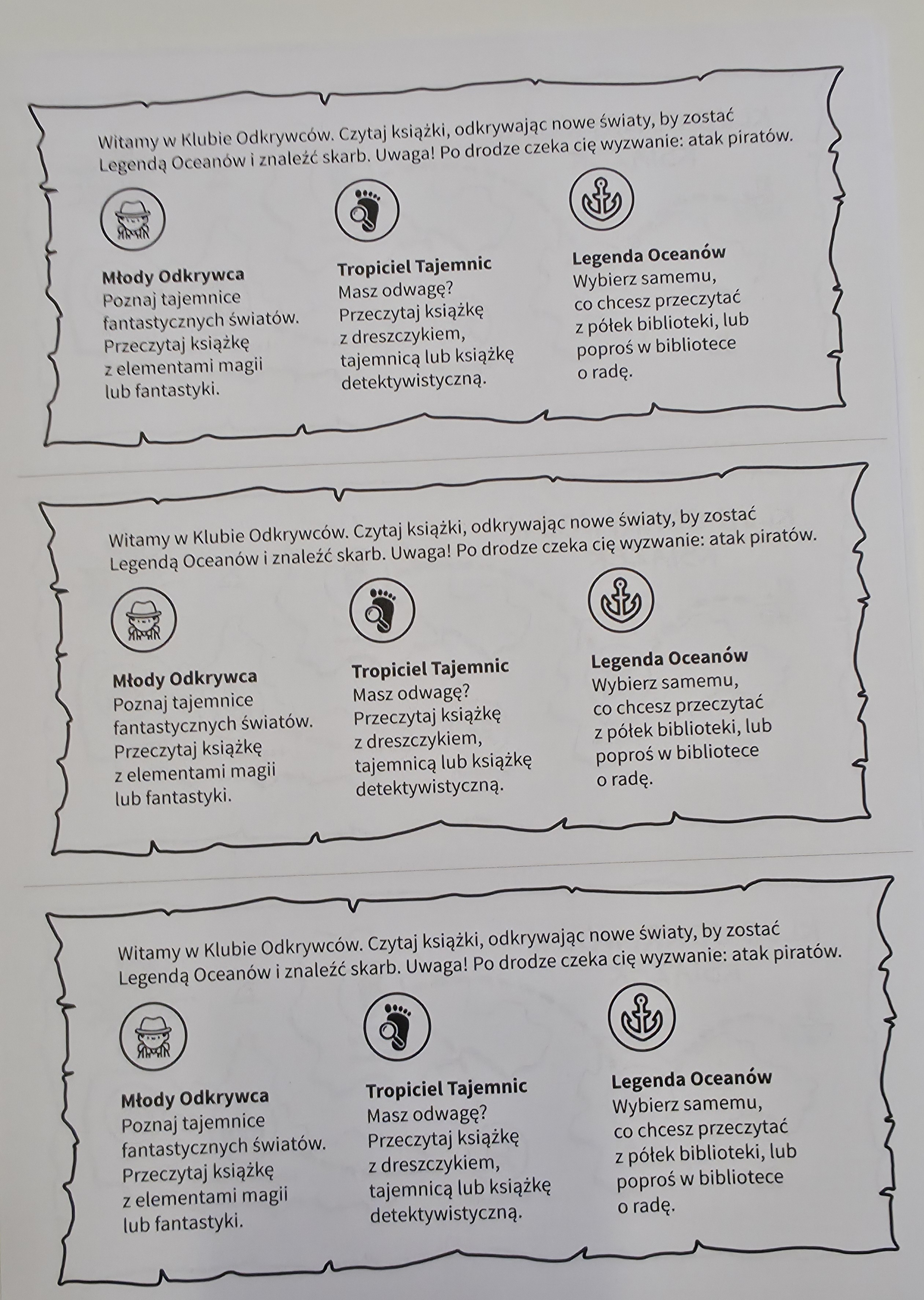 Uczniowie z klas 2,3,4 i 5. Zapraszam Was do Klubu Odkrywców Książek. W bibliotece czekają karty z wyzwaniami. Uczestnicy będą czytać kolejne książki, odkrywając lądy i zdobywając stopnie odkrywców. Polecam nowości książkowe kupione w ramach Narodowego Programu Rozwoju Czytelnictwa.