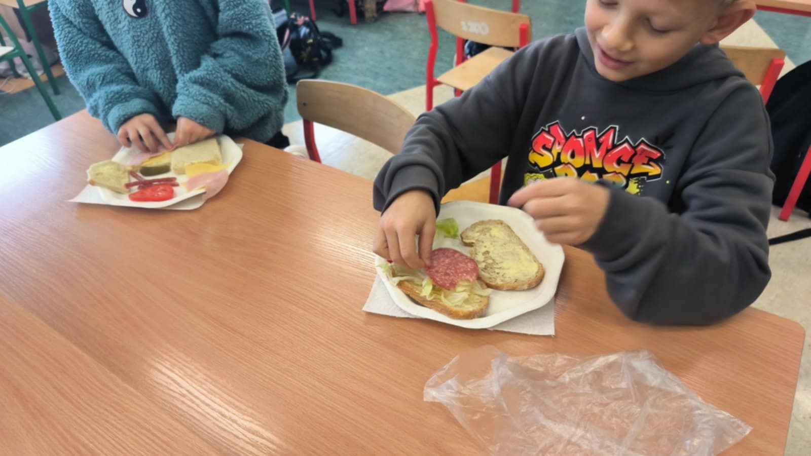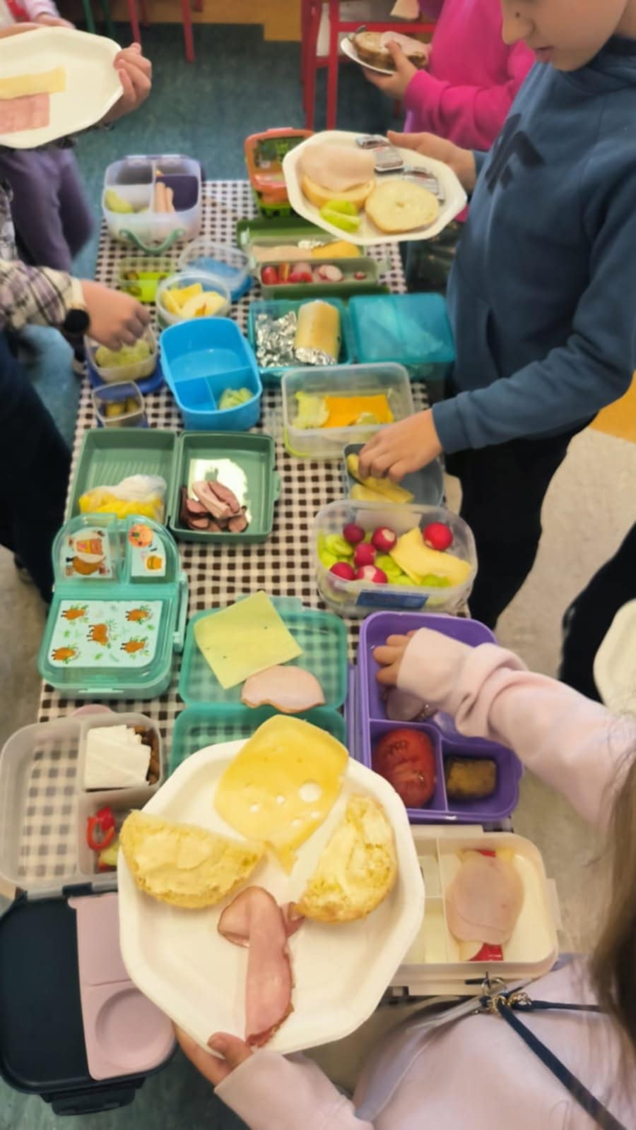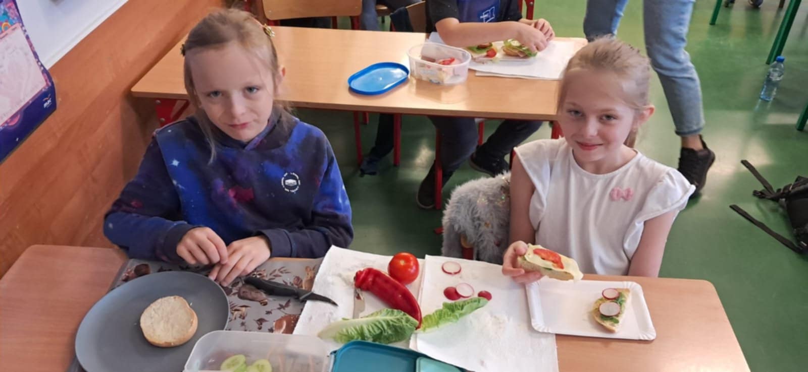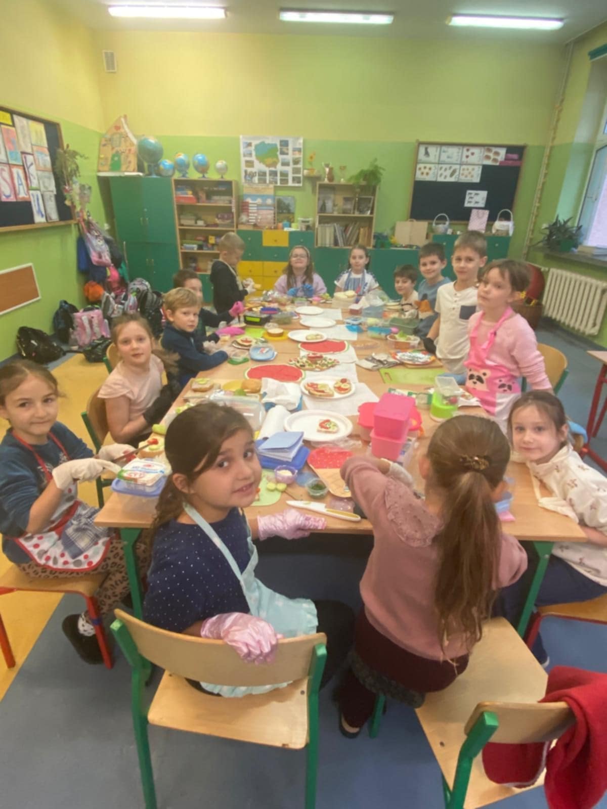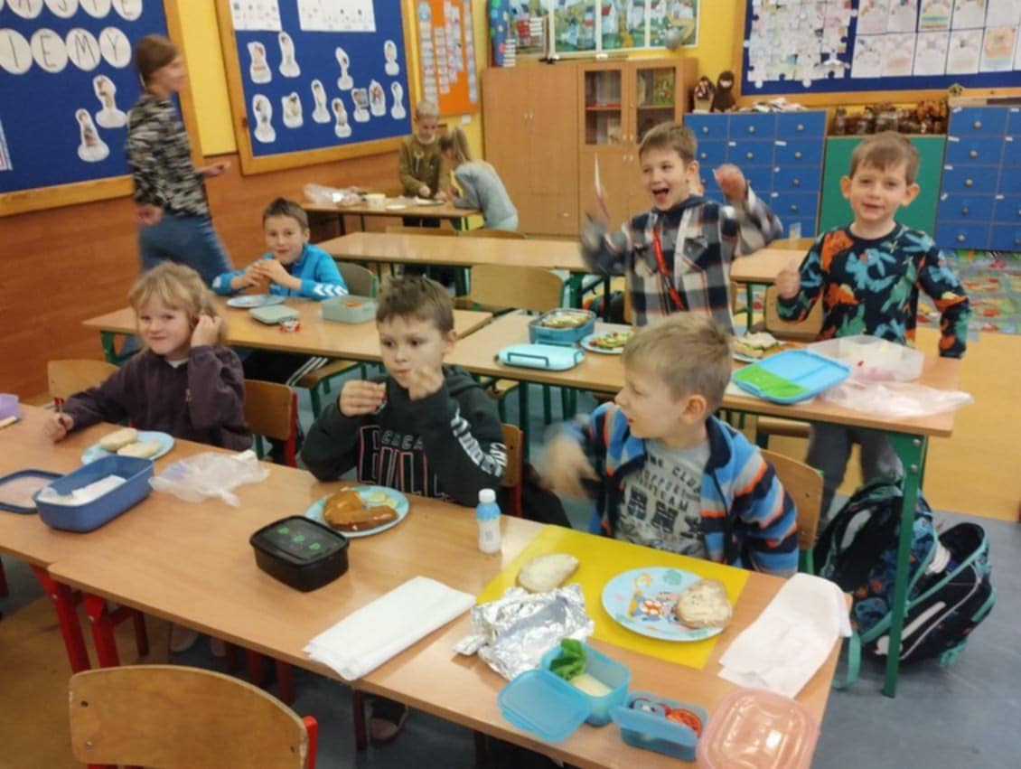 z warunkami zdrowego stylu życia, poznali piramidę żywieniową i mieli okazję, w zespołach klasowych, doświadczyć dobrej zabawy podczas przygotowania posiłku, który daje energię i niesie zdrowie. Śpiewanie Hymnu Zdrowych Dzieciaków oraz spożywanie przy wspólnym stole drugiego śniadania było dla najmłodszych uczniów dobrą zabawą ,ale także ważną lekcją . Wszystkim dzieciom życzymy tego co zdrowe i smaczne jednocześnie !