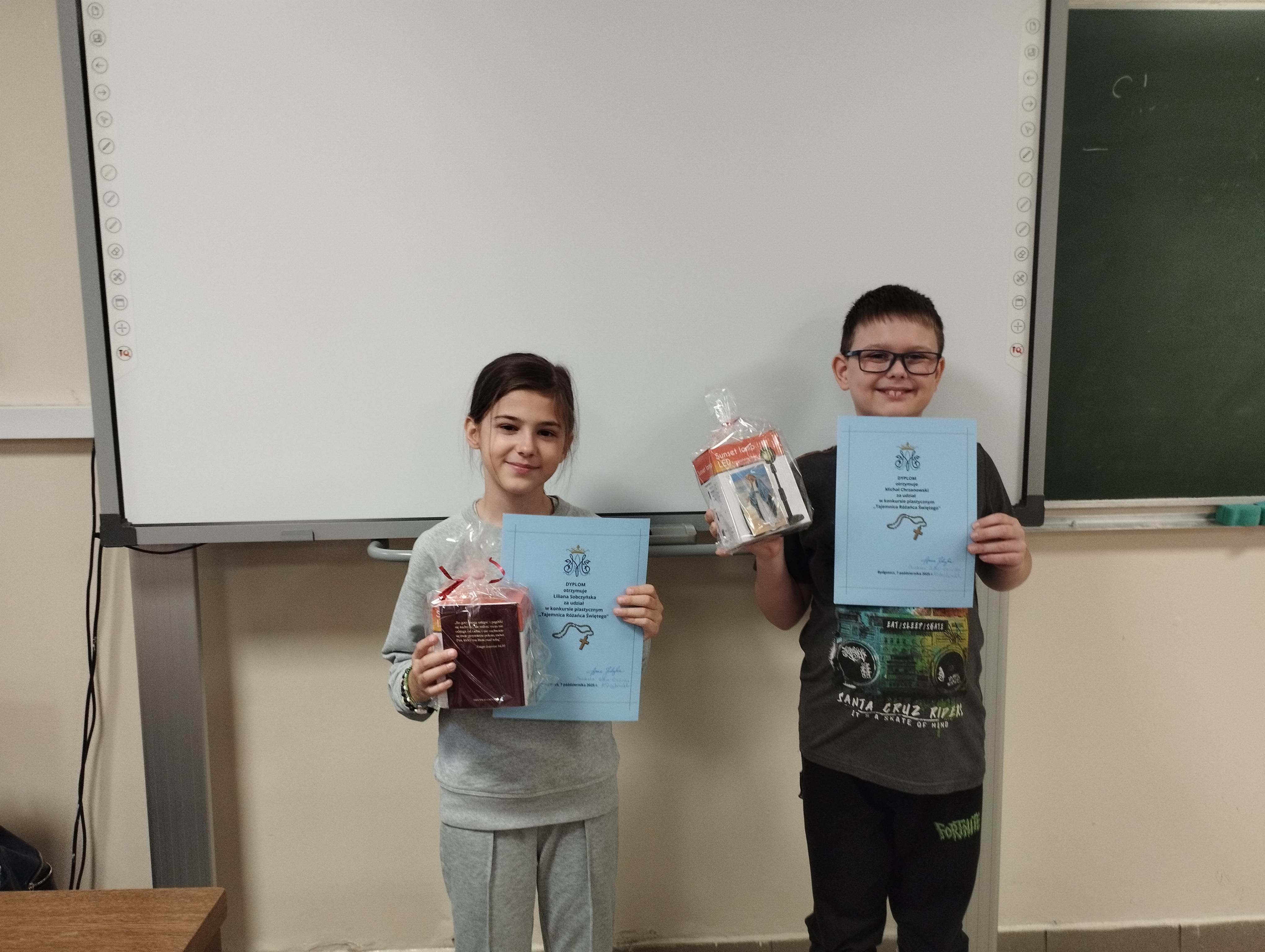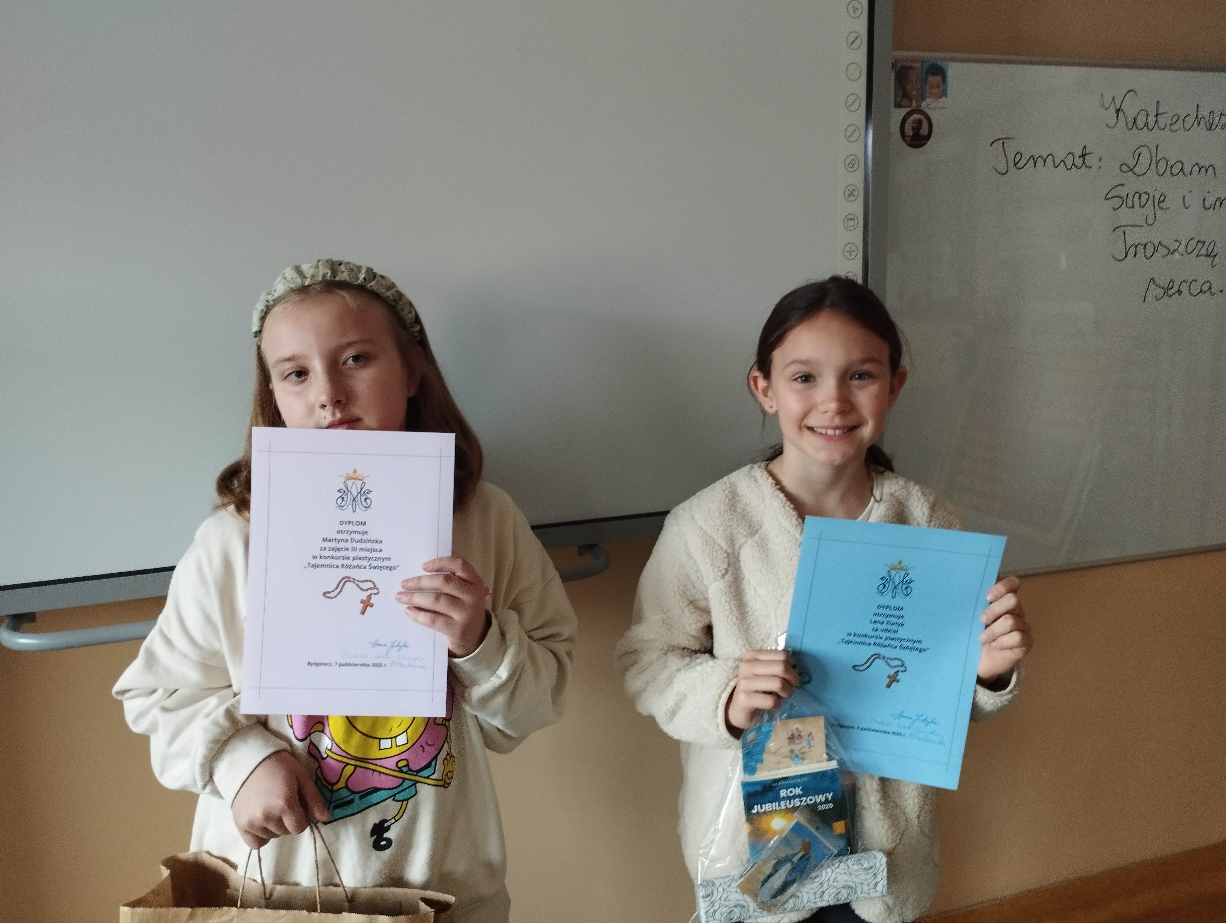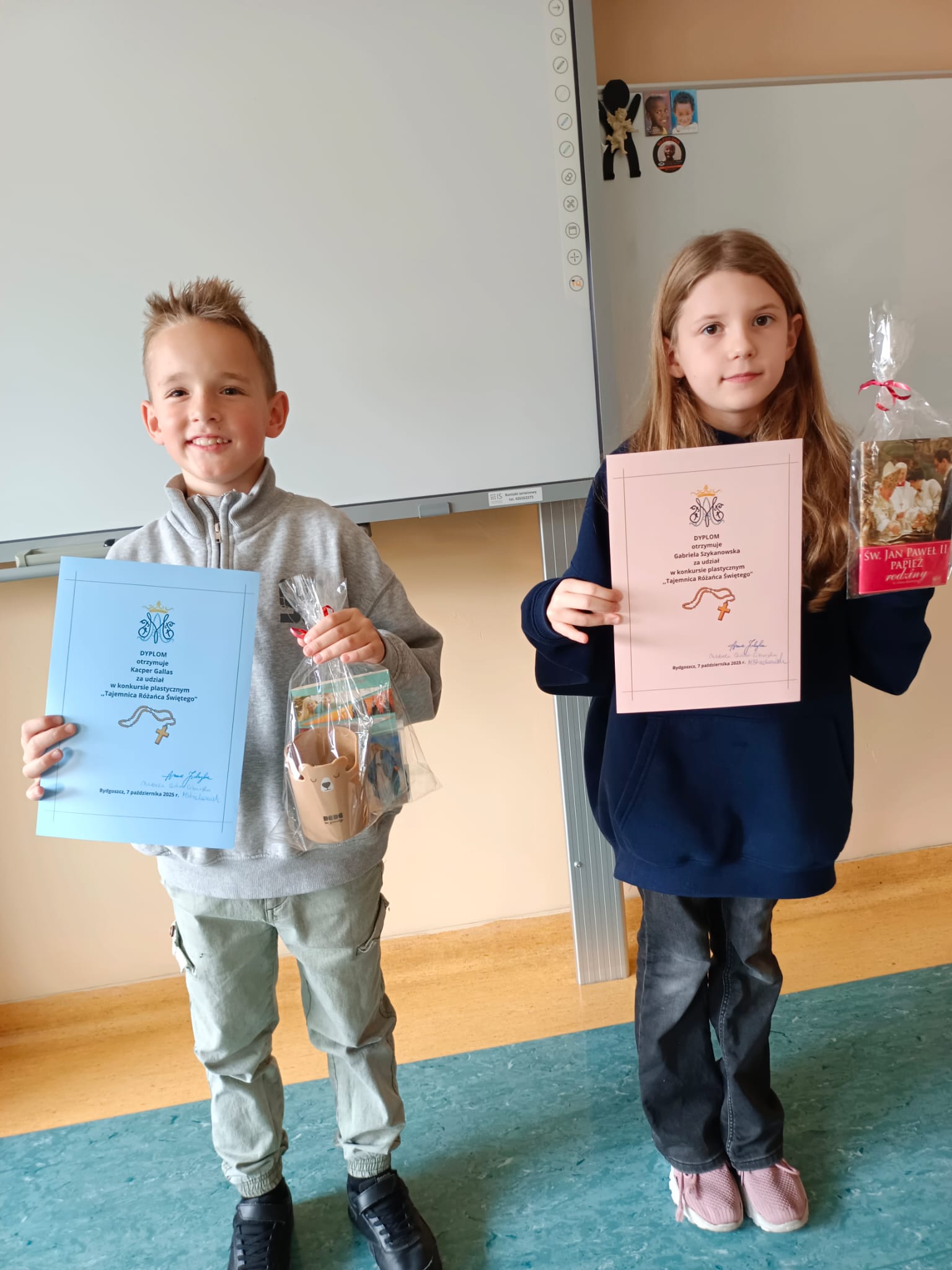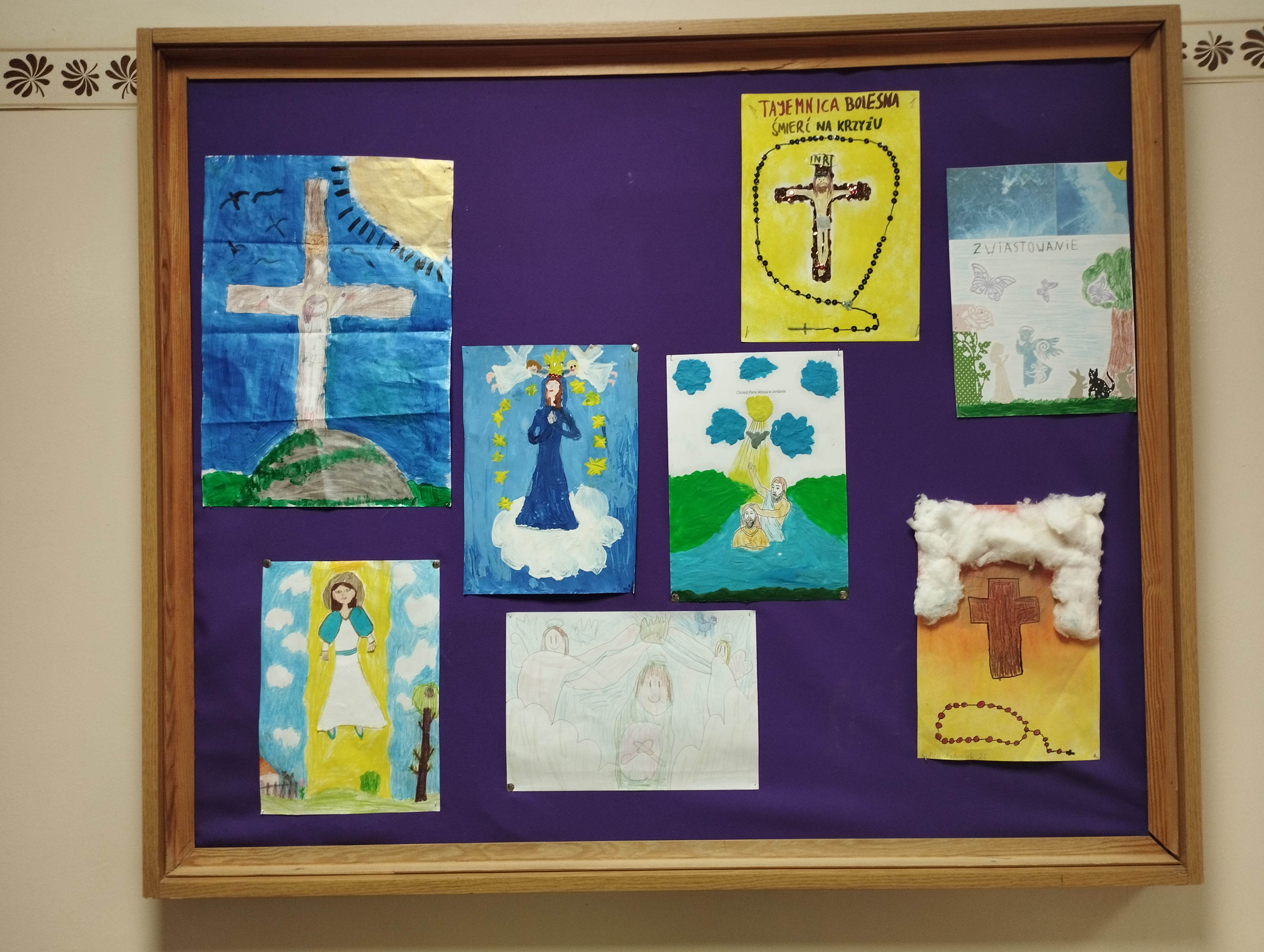 Uczniowie naszej szkoły wzięli udział w konkursie plastycznym pod nazwą „Tajemnica Różańca Świętego”. Celem konkursu było pogłębienie wiedzy o życiu Jezusa i Maryi oraz rozwój talentów plastycznych wśród dzieci. Uczestnicy wykonali prace przedstawiające jedną z tajemnic różańcowych różnorodnymi technikami. Przy ocenie prac komisja wzięła pod uwagę: zgodność z tematem konkursu, estetykę wykonania, pomysłowość i samodzielność. W kategorii klas I-III: I miejsce zajęła Nadia Nieżurawska z 2c, II miejsce zajął Patryk Kryske z 3d, a III miejsce zajęła Martyna Dudzińska z 3c. Wyróżnienie w tej kategorii otrzymała Maria Tomczak-Błoch z 2b. Z kolei w kategorii klas IV-VII: I miejsce zajęła Małgorzata Szykanowska z 5b, II miejsce zajął Antoni Kowalski z 5d, a III miejsce zajęła Maja Zygmuntowicz z 7c. Bardzo dziękujemy wszystkim za udział w konkursie oraz serdecznie gratulujemy!