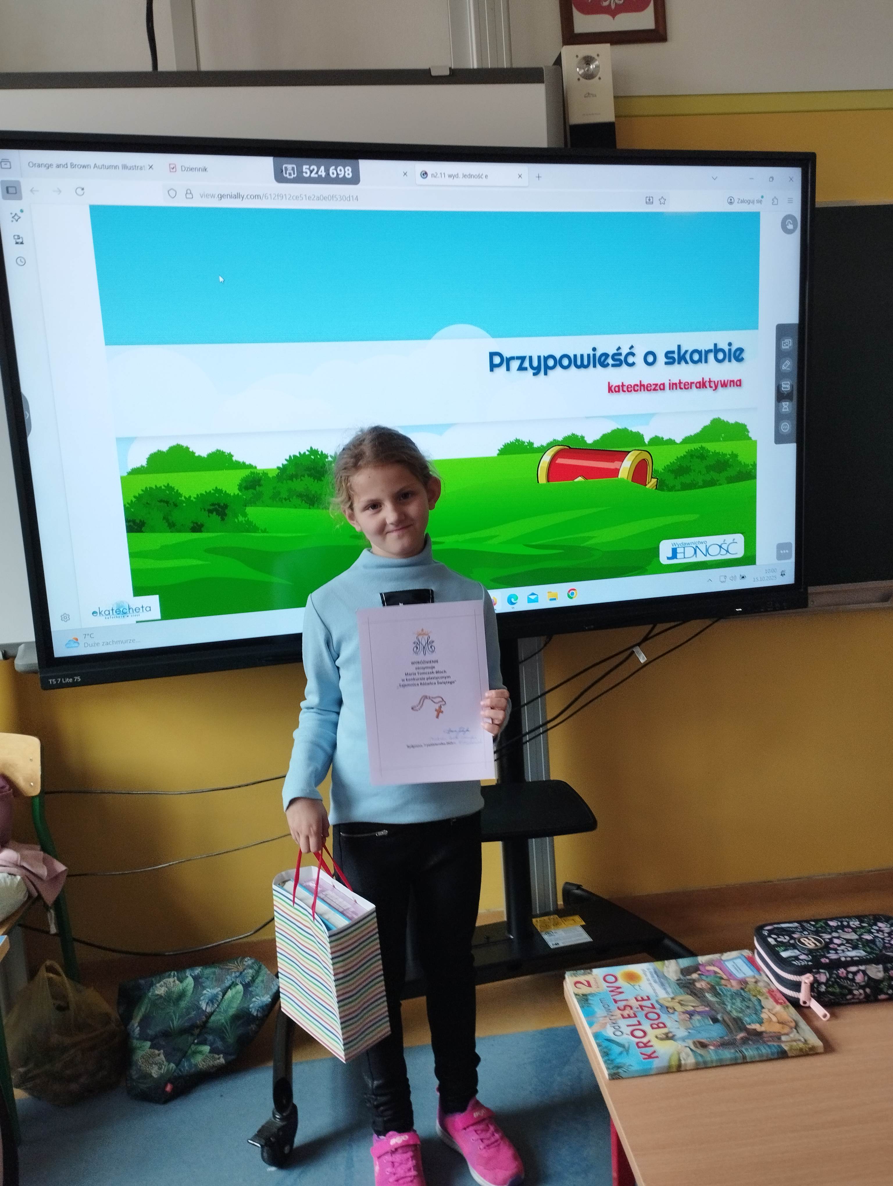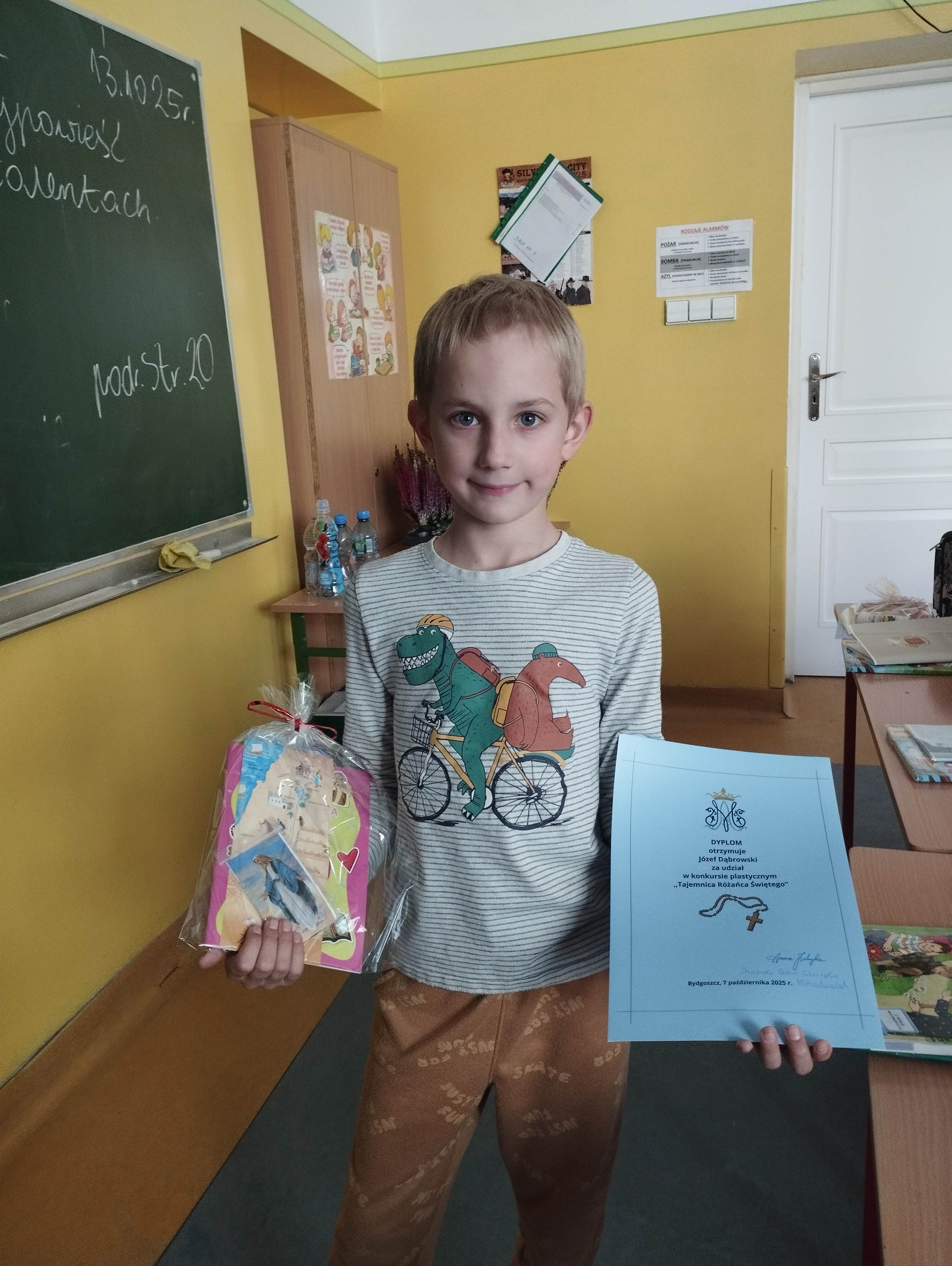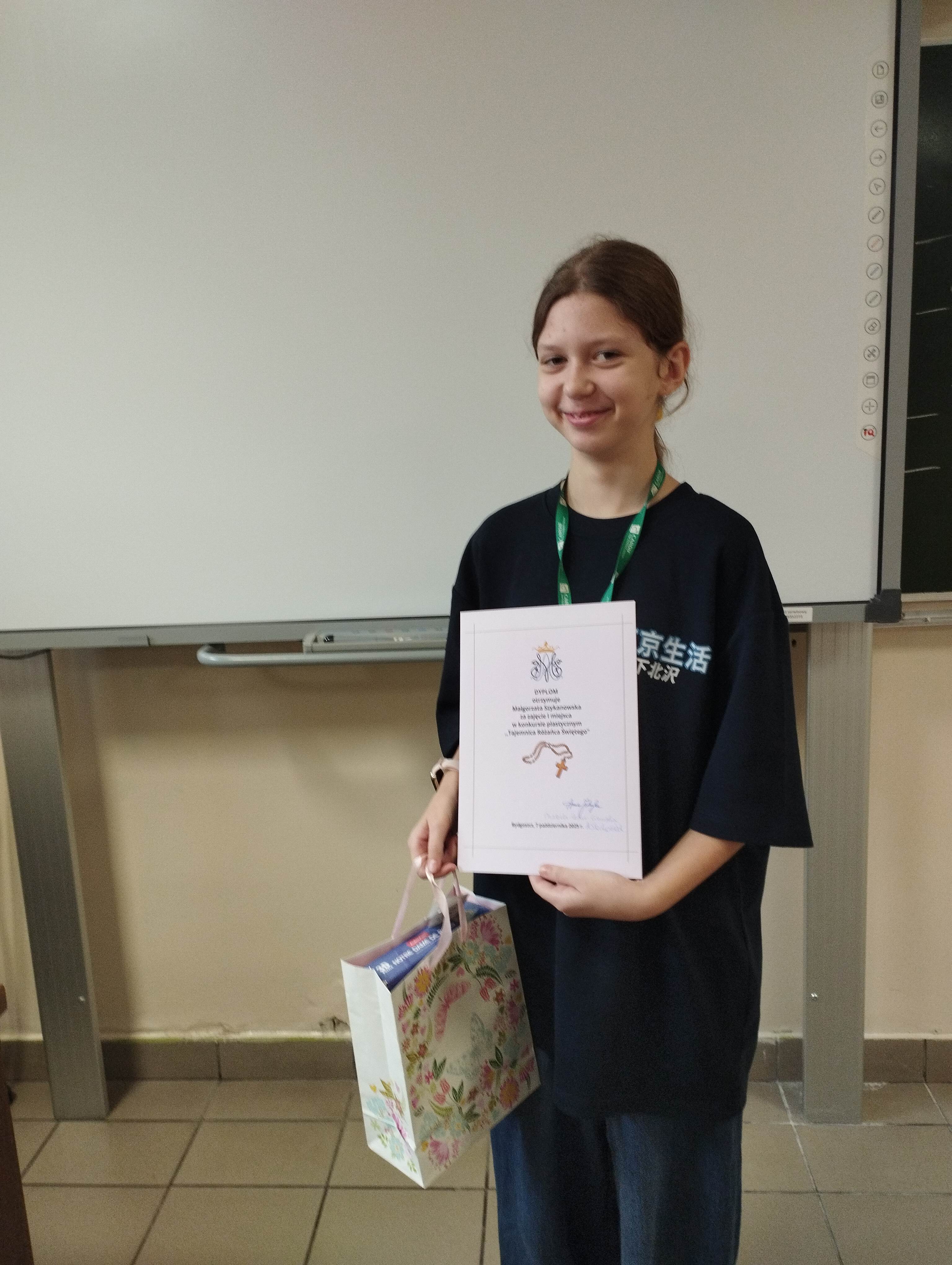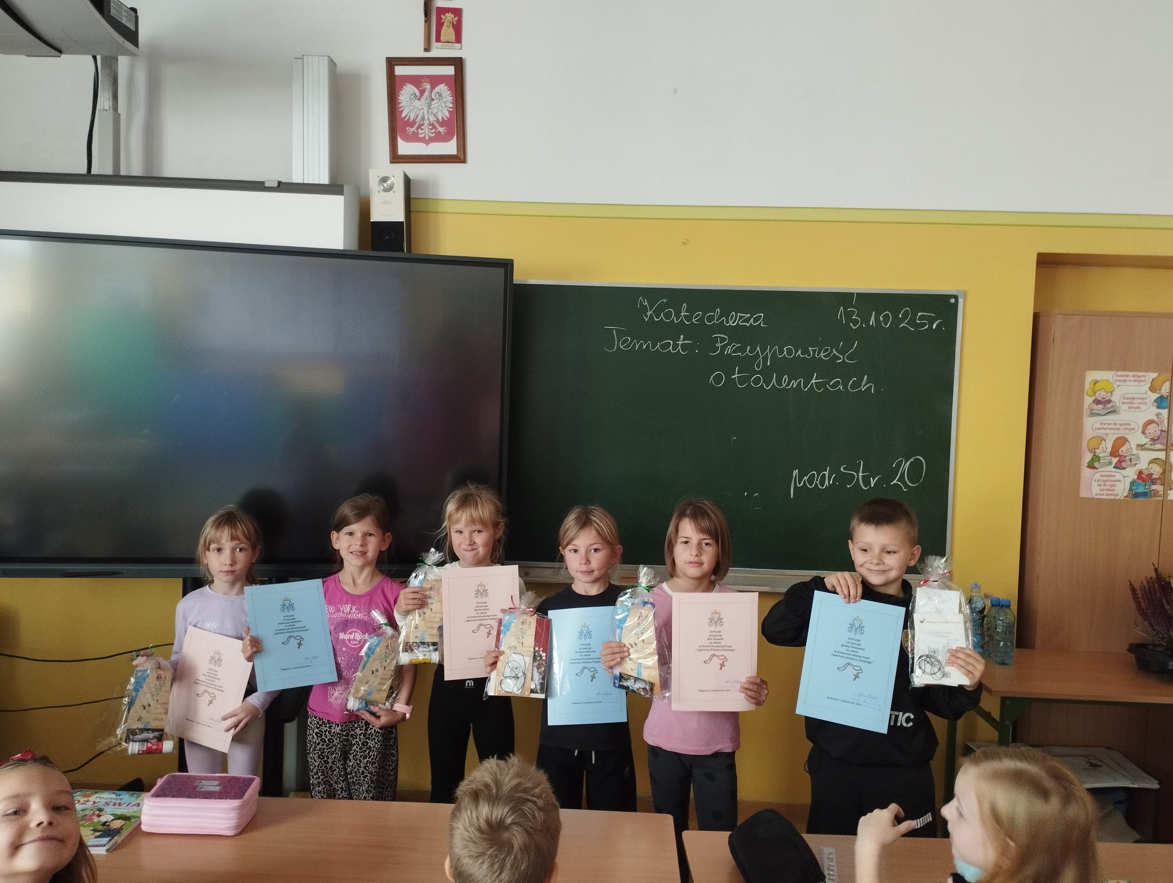 Uczniowie naszej szkoły wzięli udział w konkursie plastycznym pod nazwą „Tajemnica Różańca Świętego”. Celem konkursu było pogłębienie wiedzy o życiu Jezusa i Maryi oraz rozwój talentów plastycznych wśród dzieci. Uczestnicy wykonali prace przedstawiające jedną z tajemnic różańcowych różnorodnymi technikami. Przy ocenie prac komisja wzięła pod uwagę: zgodność z tematem konkursu, estetykę wykonania, pomysłowość i samodzielność. W kategorii klas I-III: I miejsce zajęła Nadia Nieżurawska z 2c, II miejsce zajął Patryk Kryske z 3d, a III miejsce zajęła Martyna Dudzińska z 3c. Wyróżnienie w tej kategorii otrzymała Maria Tomczak-Błoch z 2b. Z kolei w kategorii klas IV-VII: I miejsce zajęła Małgorzata Szykanowska z 5b, II miejsce zajął Antoni Kowalski z 5d, a III miejsce zajęła Maja Zygmuntowicz z 7c. Bardzo dziękujemy wszystkim za udział w konkursie oraz serdecznie gratulujemy!