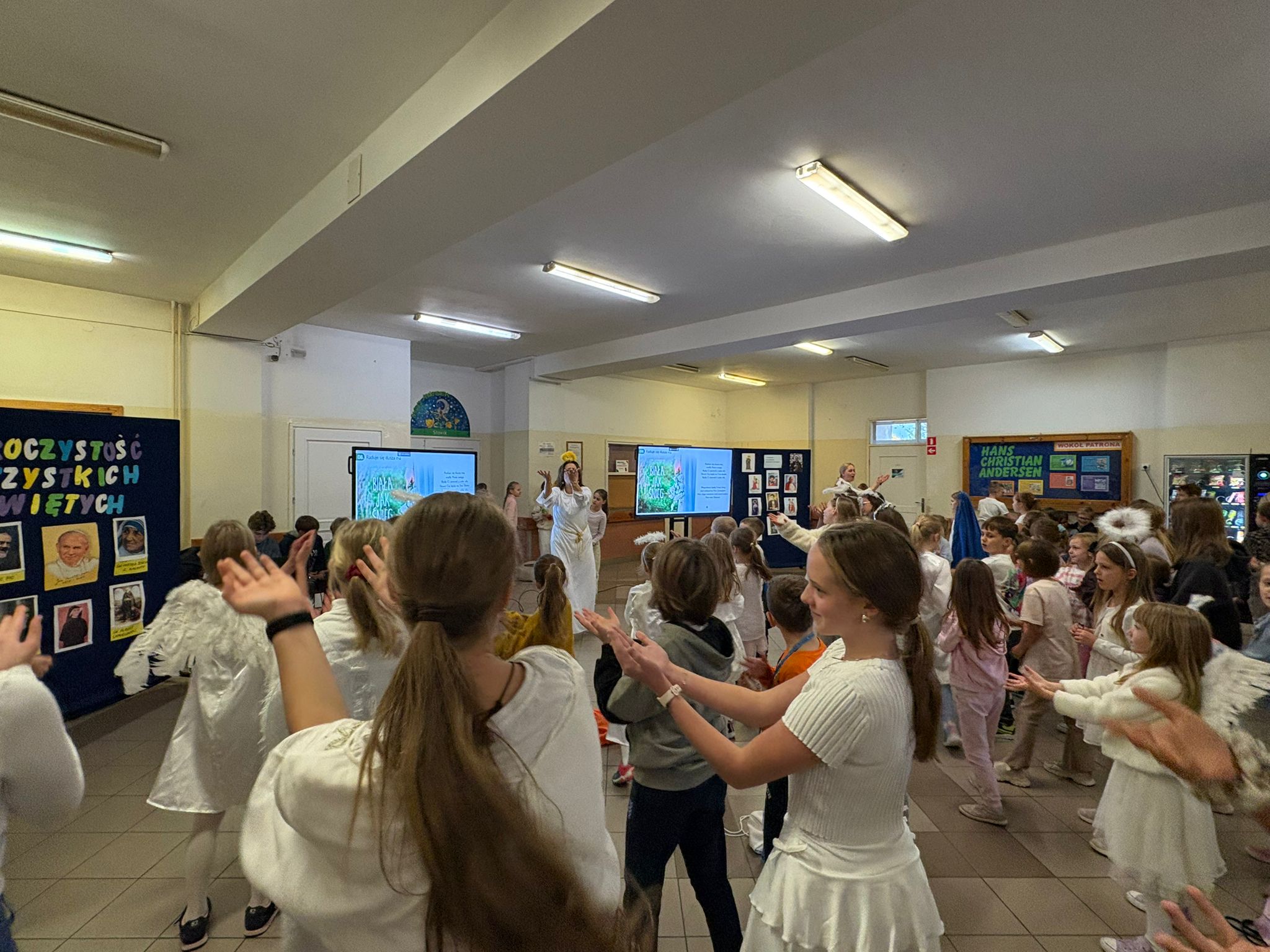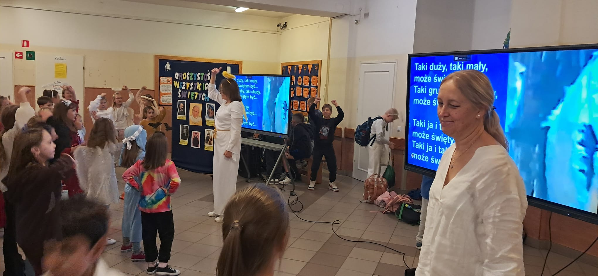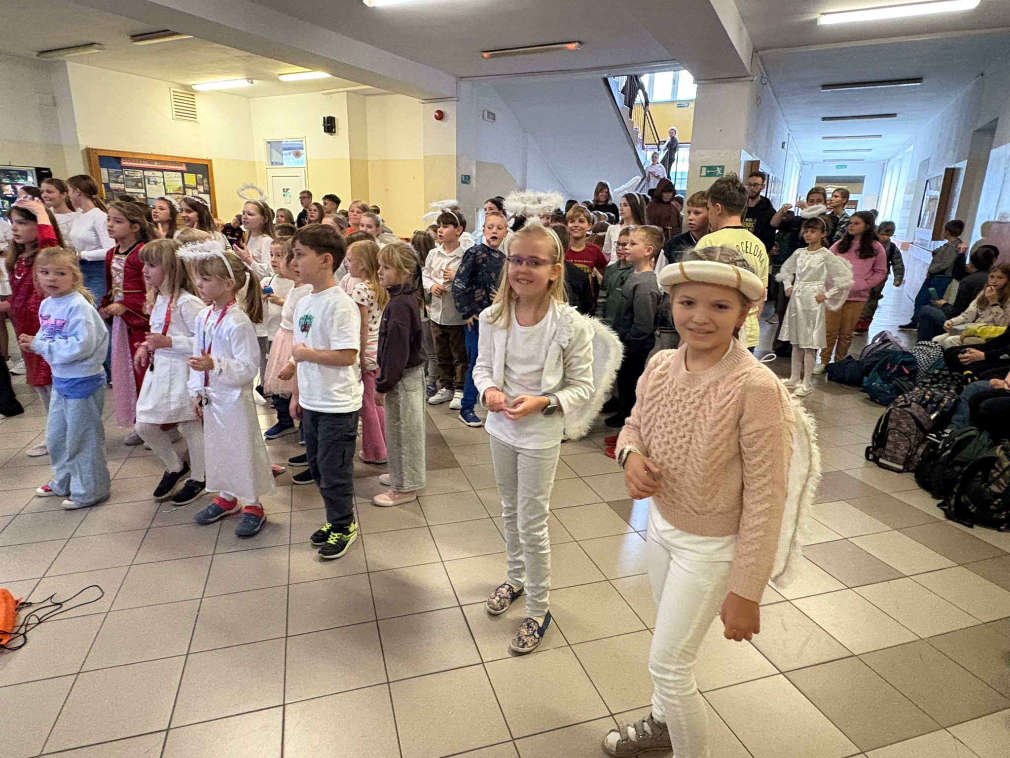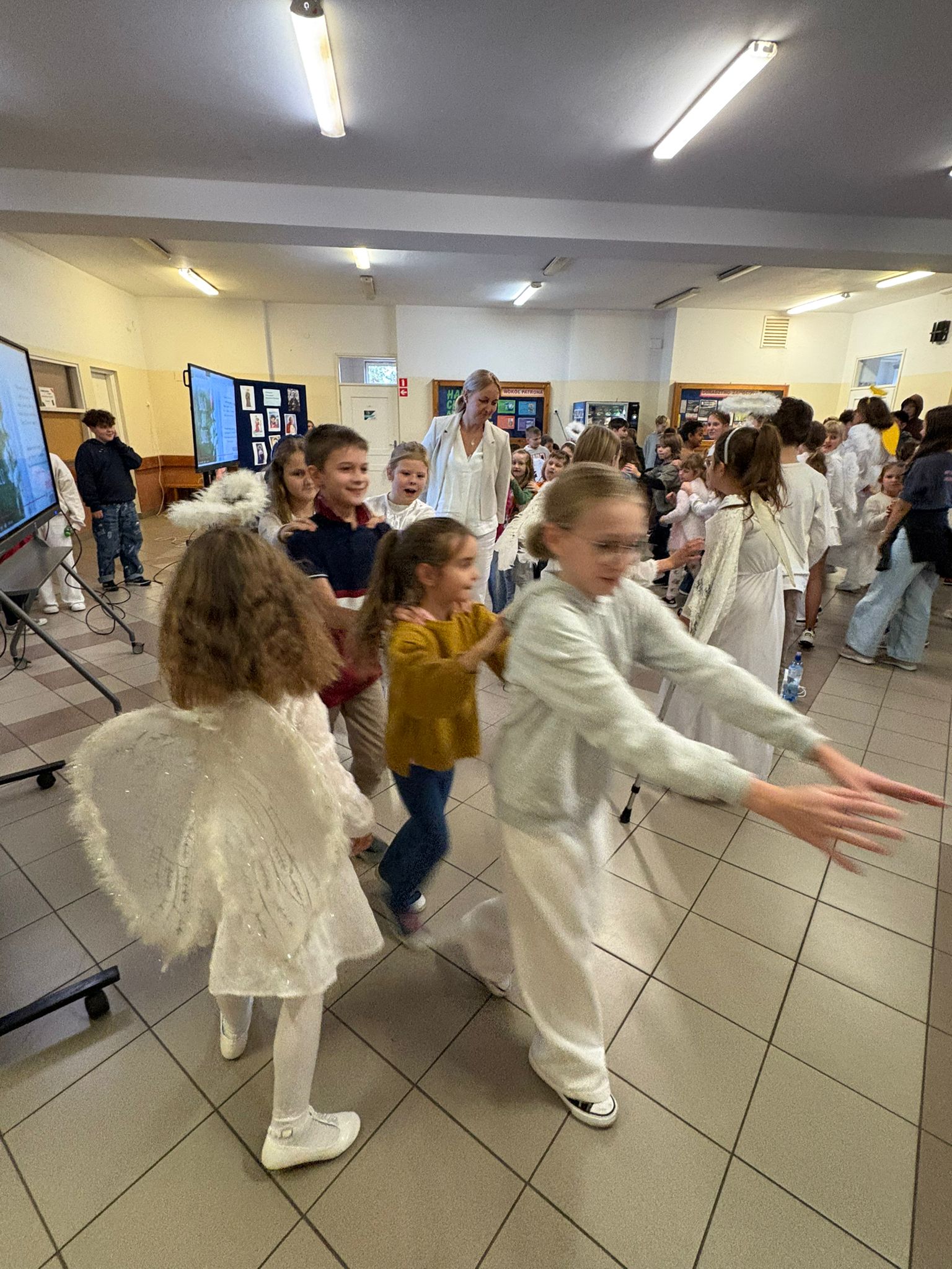 Z okazji Uroczystości Wszystkich Świętych zebraliśmy się na muzycznej przerwie, aby zaśpiewać i zatańczyć „Góry do góry” zespołu Małe TGD, „Raduje się dusza ma” zespołu Mocni w Duchu oraz „Święty Uśmiechnięty” Arki Noego. W ten sposób chcieliśmy podkreślić radosny wymiar tej Uroczystości. Uczniowie mogli przebrać się za świętych i błogosławionych, anioły, bądź ubrać się na biało. Dziękujemy wszystkim za przebranie i udział we wspólnej zabawie!