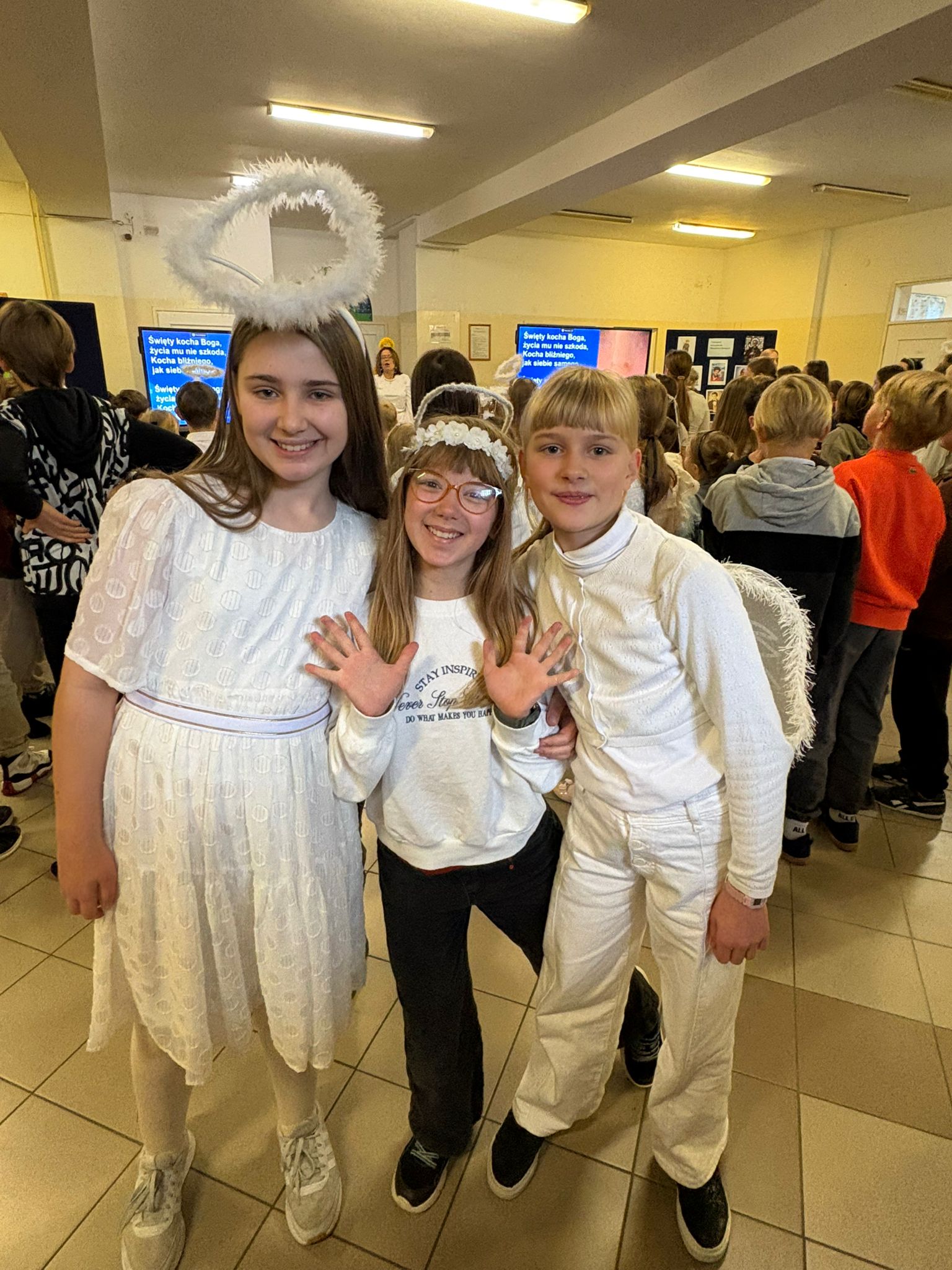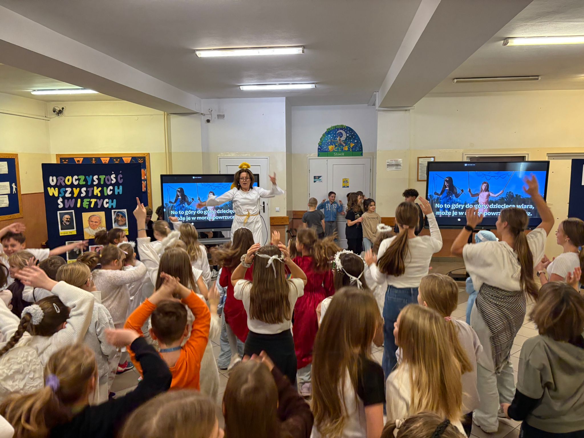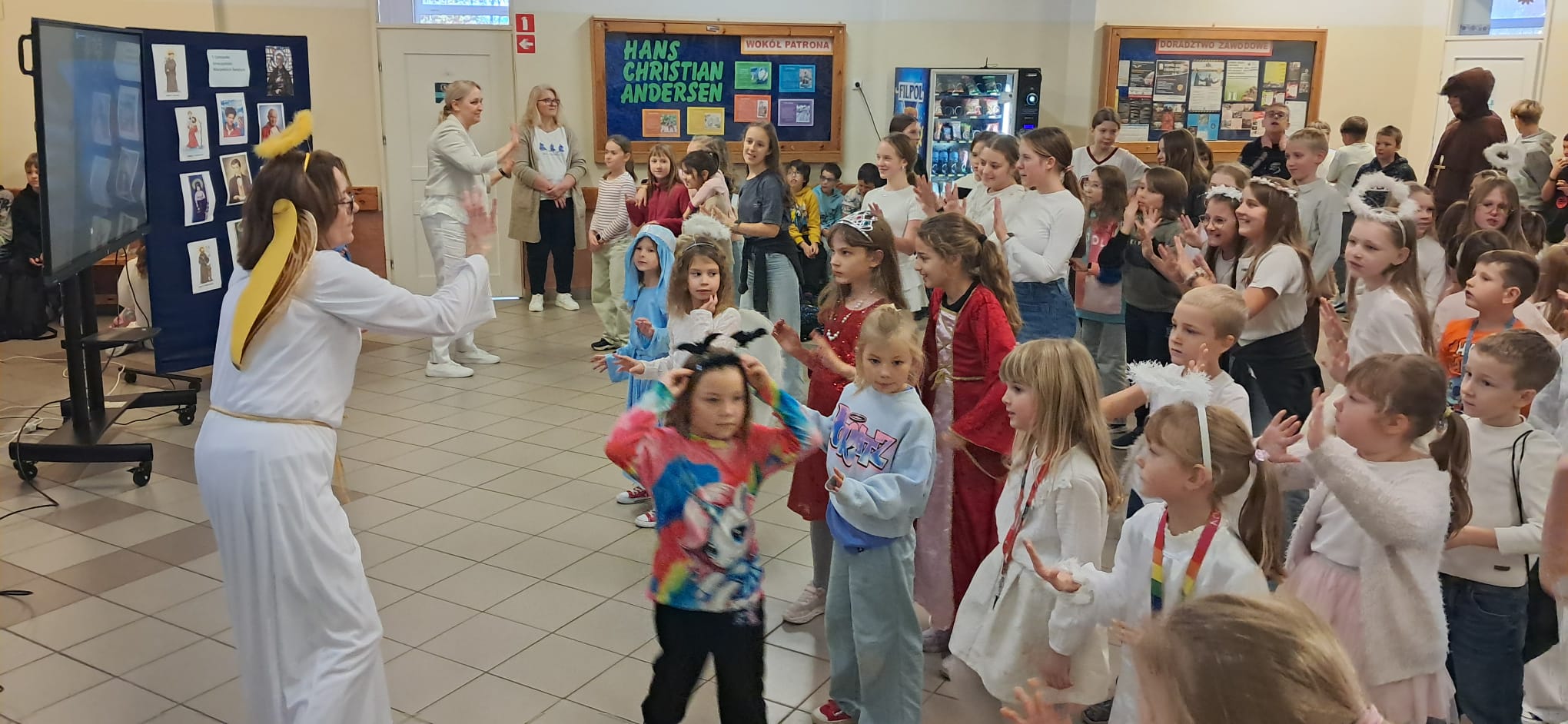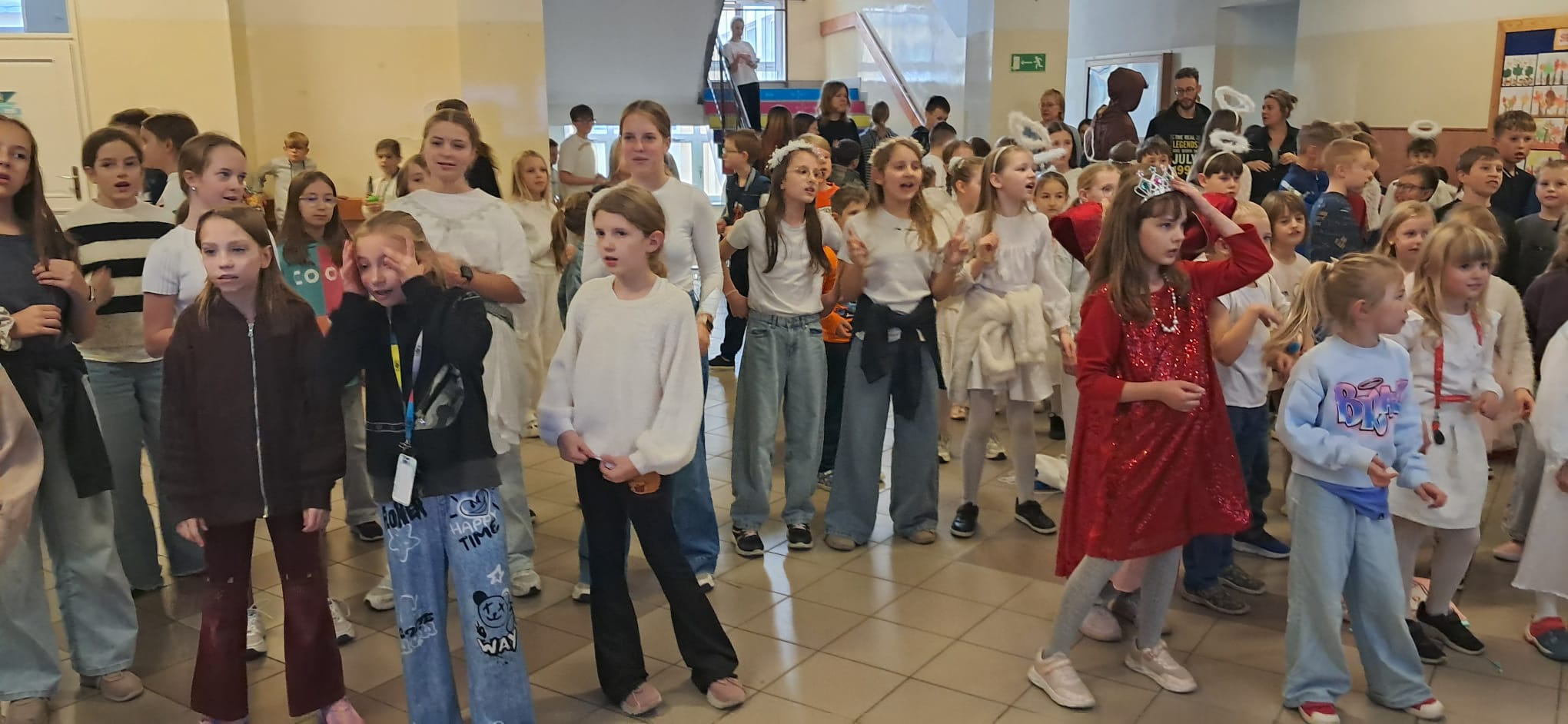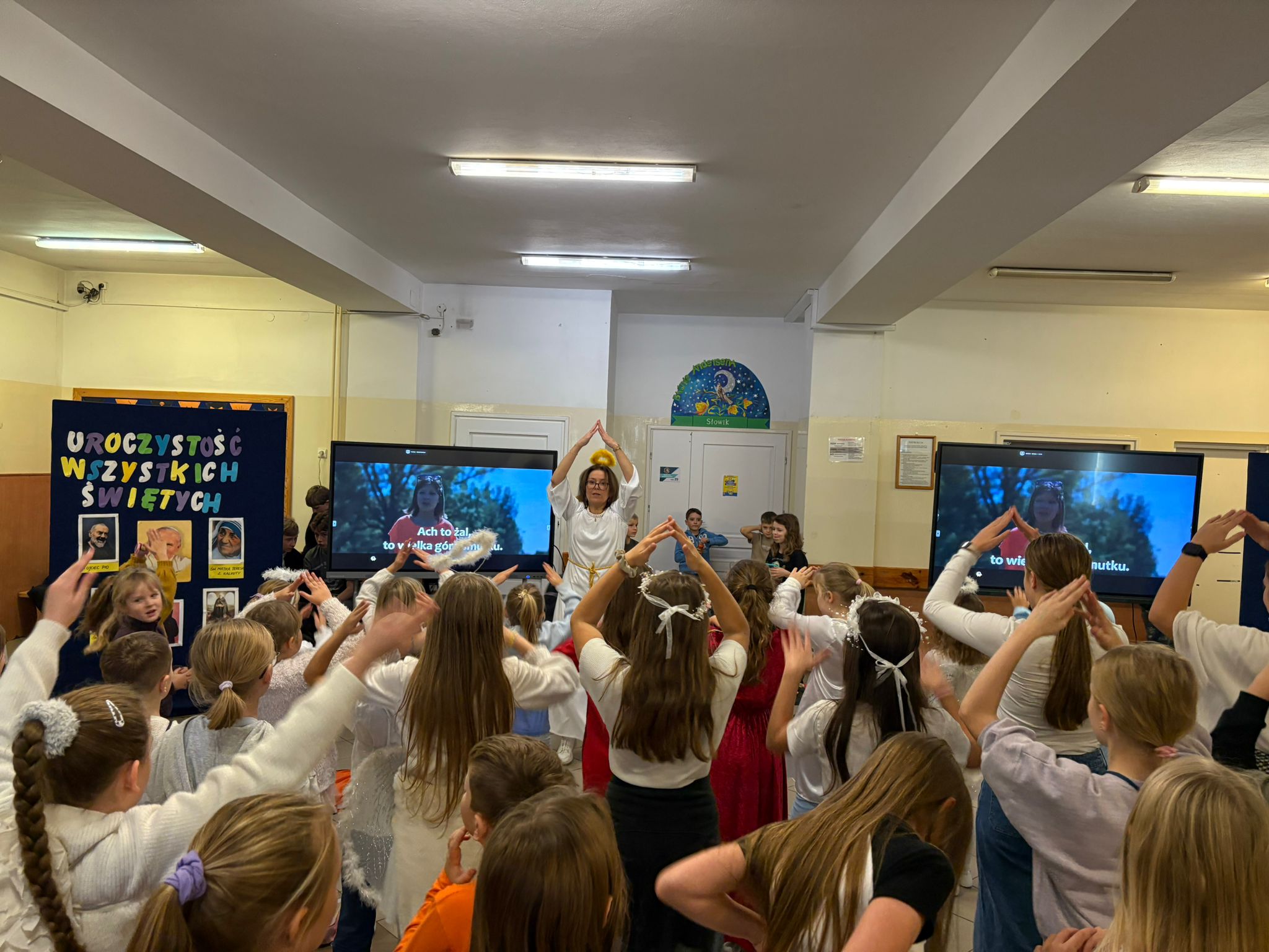 Z okazji Uroczystości Wszystkich Świętych zebraliśmy się na muzycznej przerwie, aby zaśpiewać i zatańczyć „Góry do góry” zespołu Małe TGD, „Raduje się dusza ma” zespołu Mocni w Duchu oraz „Święty Uśmiechnięty” Arki Noego. W ten sposób chcieliśmy podkreślić radosny wymiar tej Uroczystości. Uczniowie mogli przebrać się za świętych i błogosławionych, anioły, bądź ubrać się na biało. Dziękujemy wszystkim za przebranie i udział we wspólnej zabawie!
