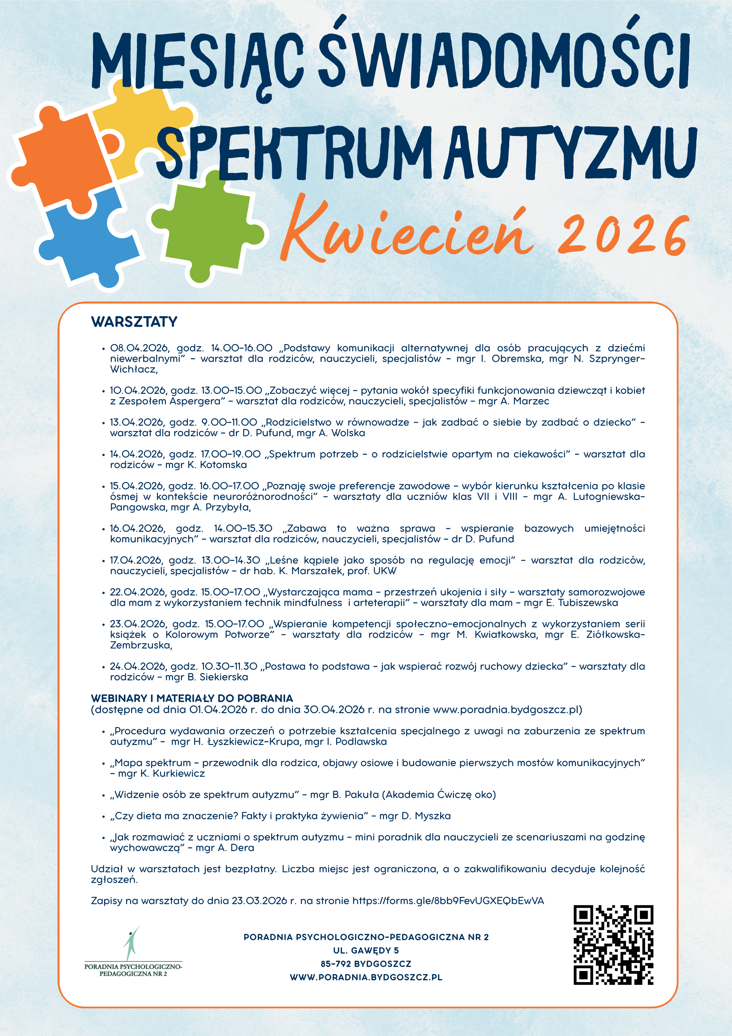 serdecznie zapraszamy do udziału w warsztatach z okazji Miesiąca Świadomości Spektrum Autyzmu organizowanych w kwietniu 2026 r. w Poradni Psychologiczno-Pedagogicznej nr 2 w Bydgoszczy.
